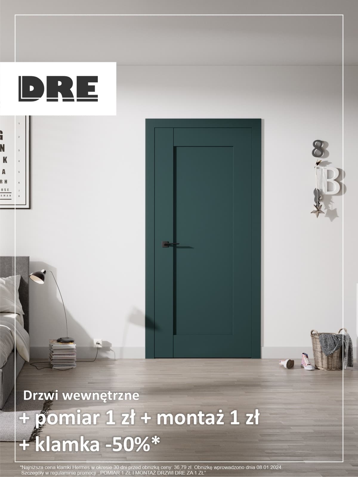 *Najniższa cena klamki Hermes w okresie 30 dni przed obniżką ceny: 36,79 zł. Obniżkę wprowadzono 08.01.2024. Szczegóły w regulaminie promocji „Pomiar za 1zł i montaż drzwi DRE za 1 zł.”