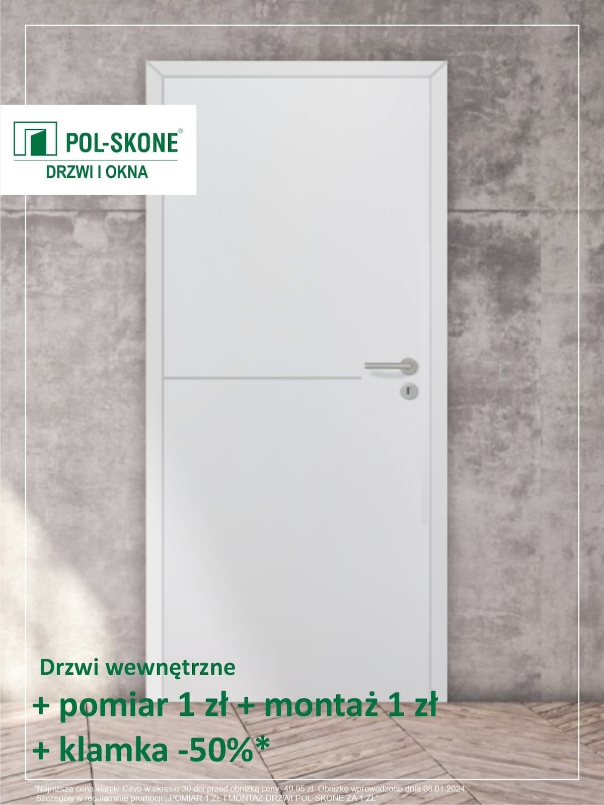 *Najniższa cena klamki Cavo w okresie 30 dni przed obniżką ceny: 49,95 zł. Obniżkę wprowadzono 08.01.2024. Szczegóły w regulaminie promocji „Pomiar za 1zł i montaż drzwi Pol-Skone za 1 zł.”