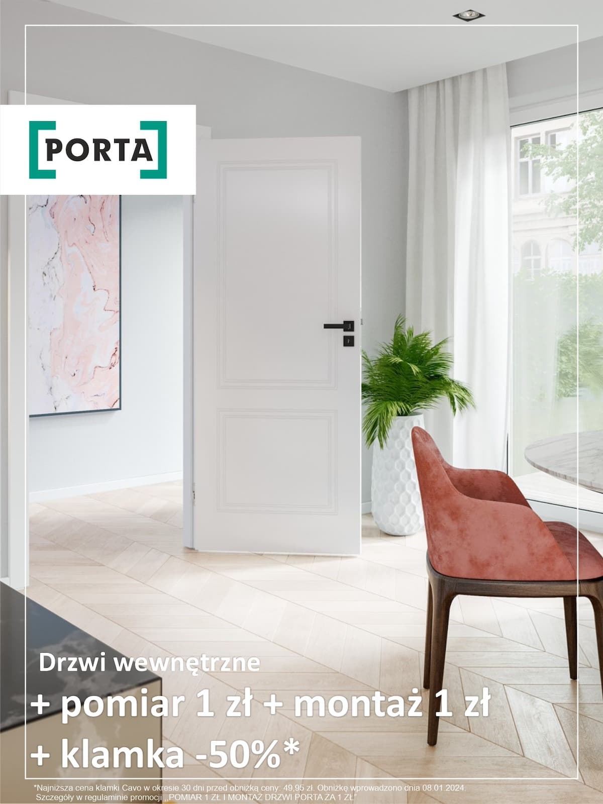 *Najniższa cena klamki Cavo w okresie 30 dni przed obniżką ceny: 49,95 zł. Obniżkę wprowadzono 08.01.2024. Szczegóły w regulaminie promocji „Pomiar za 1zł i montaż drzwi PORTA za 1 zł.”