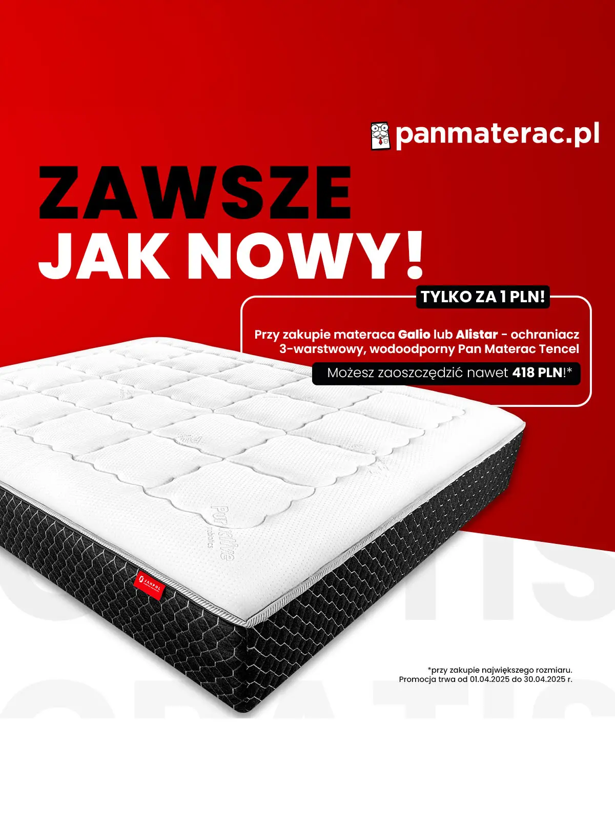 Promocja w dniach 01.04 - 30.04.2025 r. Więcej szczegółów w salonach Pan Materac i na www.panmaterac.pl