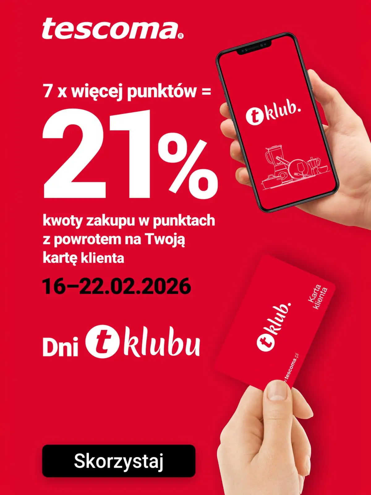 Czy wiesz, jak błyskawicznie zwiększyć liczbę swoich punktów lojalnościowych? Wystarczy być lub zostać członkiem Klubu TESCOMA i zrobić zakupy w dniach 16 - 22 lutego 2026, a 21% kwoty zakupu wróci na Twoją kartę lojalnościową w postaci punktów!