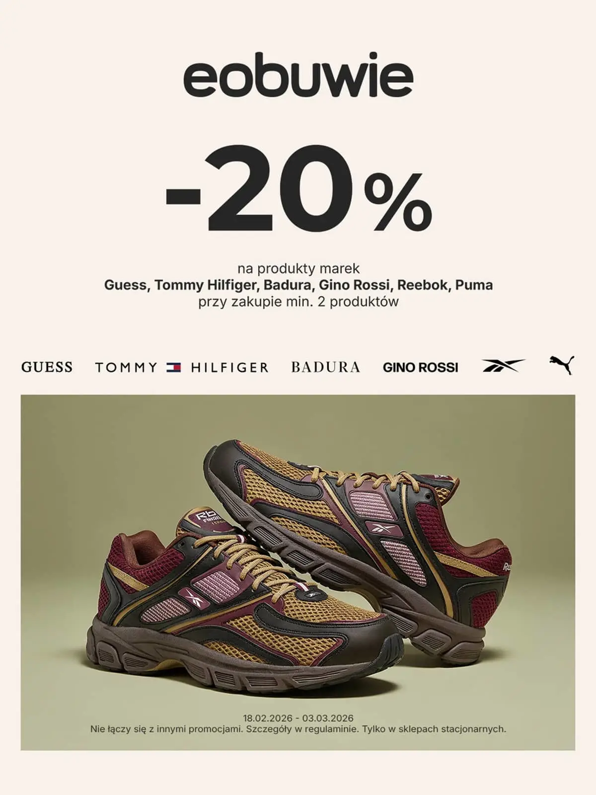Reebok, Tommy Hilfiger, Guess Puma, Badura oraz Gino Rossi z 20% rabatem przy zakupie min. 2 produktów! Warunek promocji (min. 2 produkty w koszyku) spełnisz dowolnymi produktami z oferty sklepu stacjonarnego eobuwie!