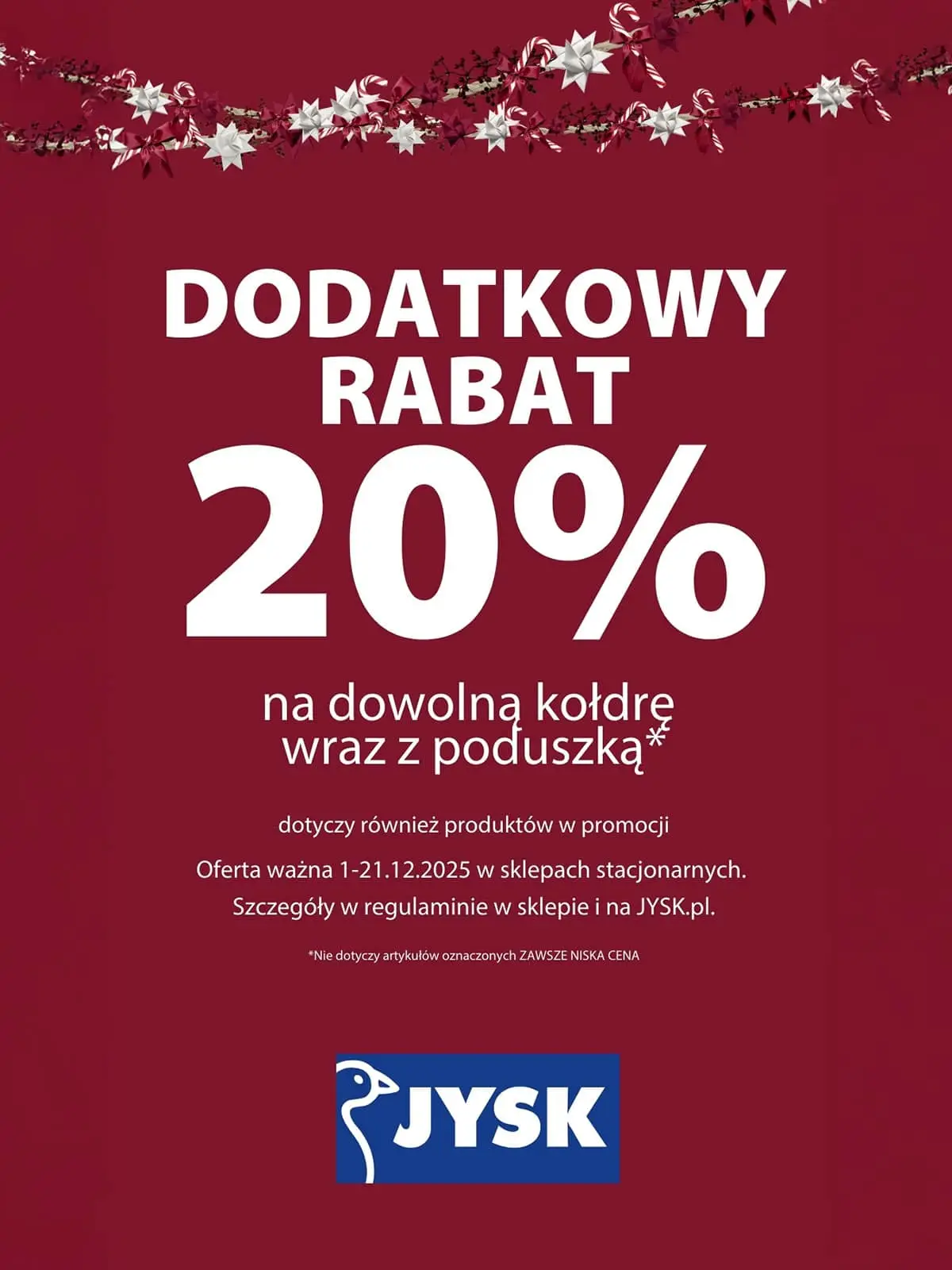 Oferta dotyczy również produktów w promocji i jest ważna w dniach 1-21.12.2025 w sklepach stacjonarnych JYSK.
