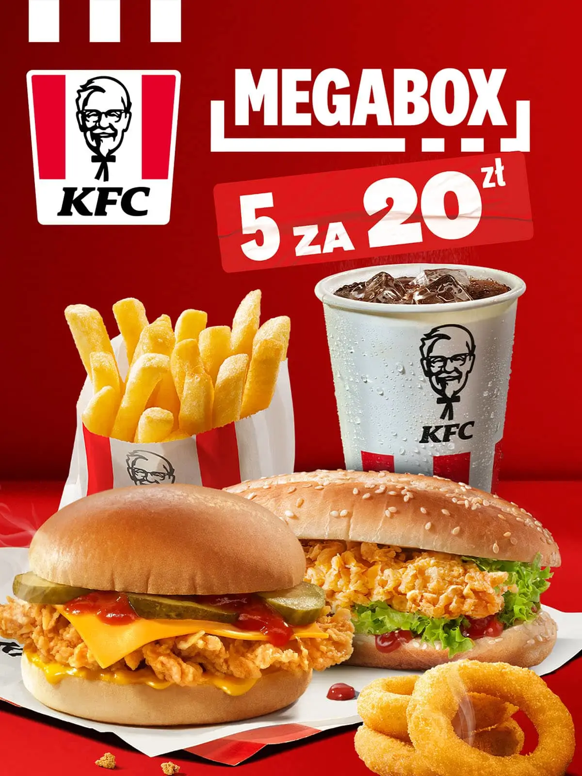 Tylko teraz w KFC! MEGA BOX - 5 za 20, wybierz swoje ulubione produkty: Cheeseburger, Longer lub iTwist, Wielka Dolewka i pyszne dodatki za 20 zł!