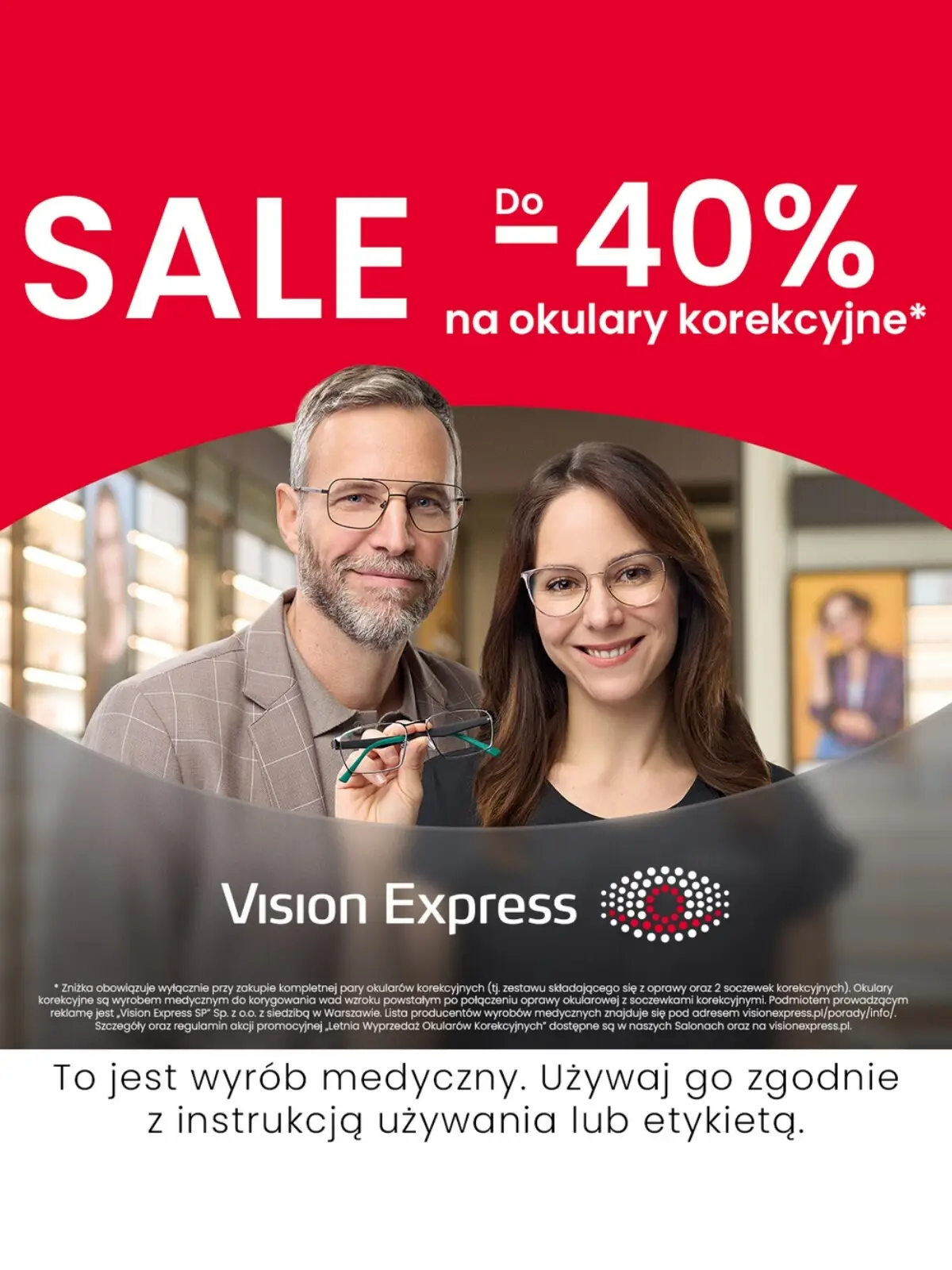 Okulary korekcyjne są wyrobem medycznym do korygowania wad wzroku powstałym po połączeniu oprawy okularowej z soczewkami korekcyjnymi. Podmiot prowadzący reklamę: „Vision Express SP” Sp. z o.o. z siedzibą w Warszawie. Lista producentów wyrobów medycznych dostępna pod adresem visionexpress.pl/porady/info/.